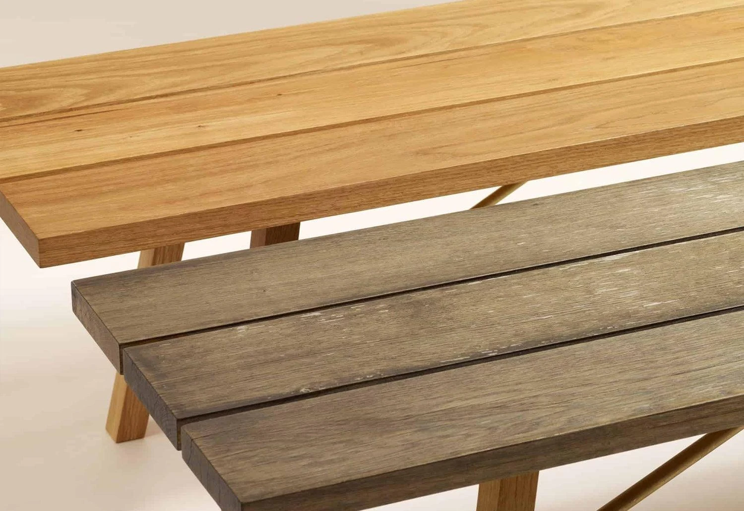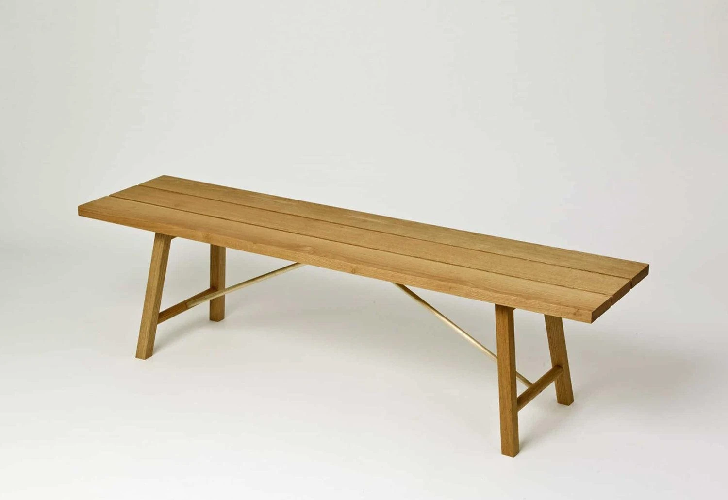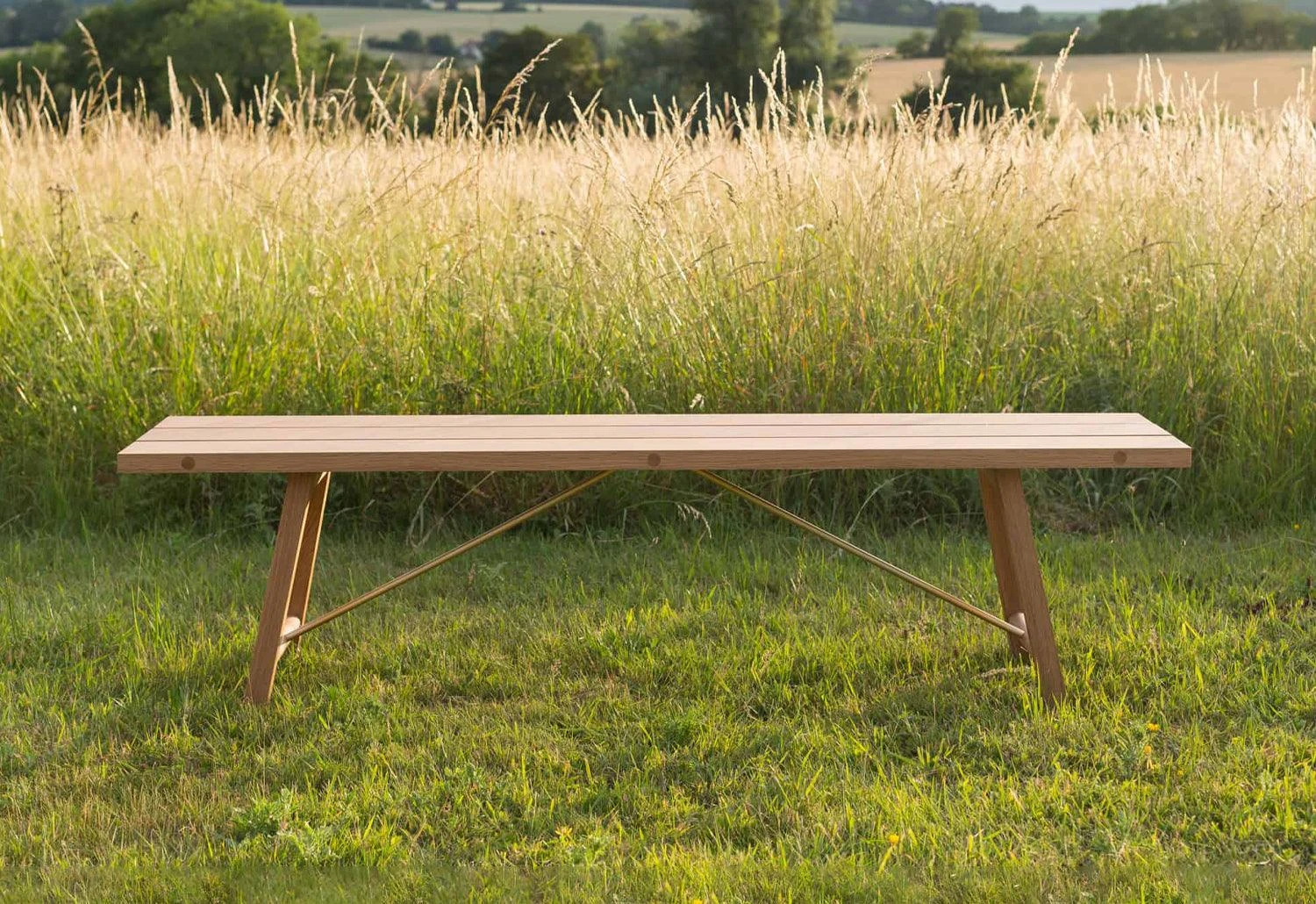 Generous in scale and accented with beautiful brass detailing, Outdoor Bench Two is the outdoor version of the indoor Side Bench Two.