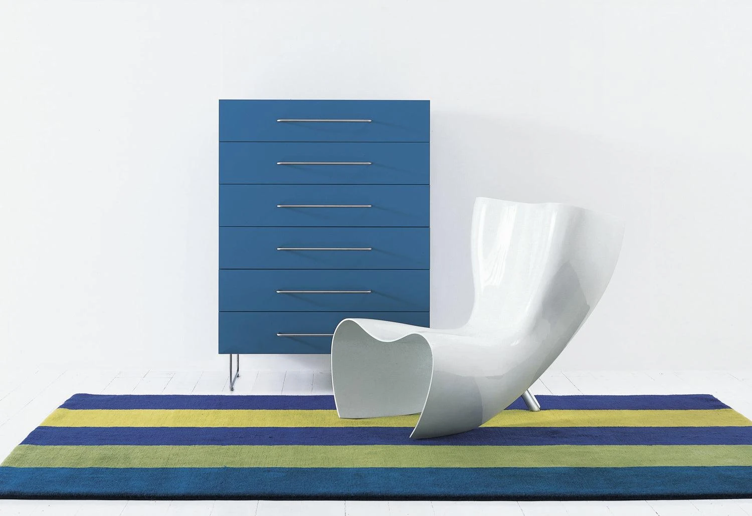 Designed by Marc Newson, the sculptural seat has a fortified fibreglass shell, available in a vast array of glossy-finished colours, including orange, red, blue, white or black.