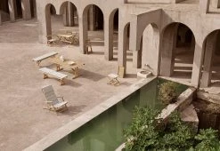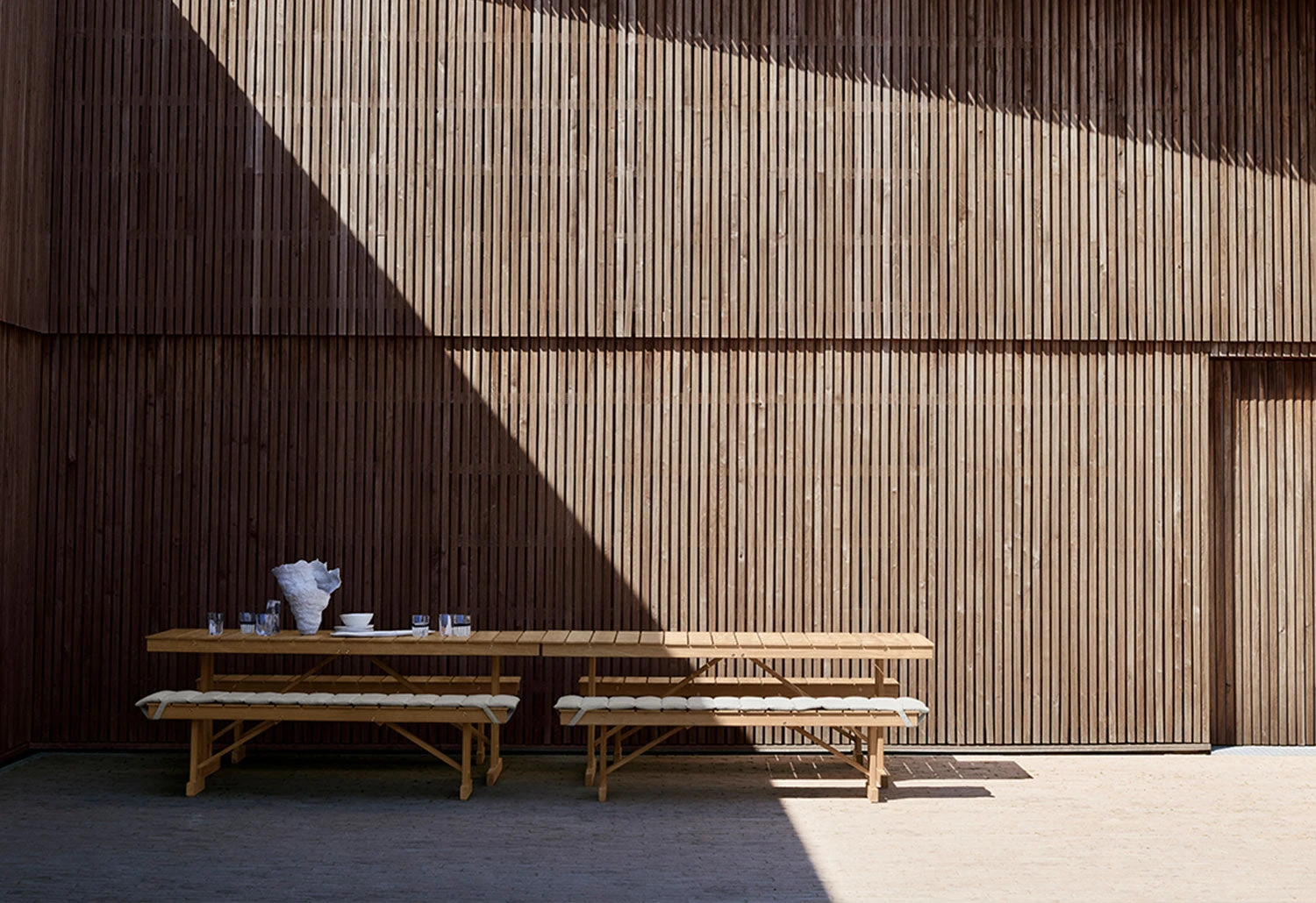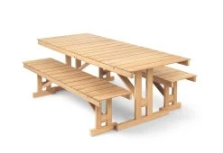 The collection of outdoor table and benches created by Børge Mogensen in 1971 showcases the designer’s functional approach to design.