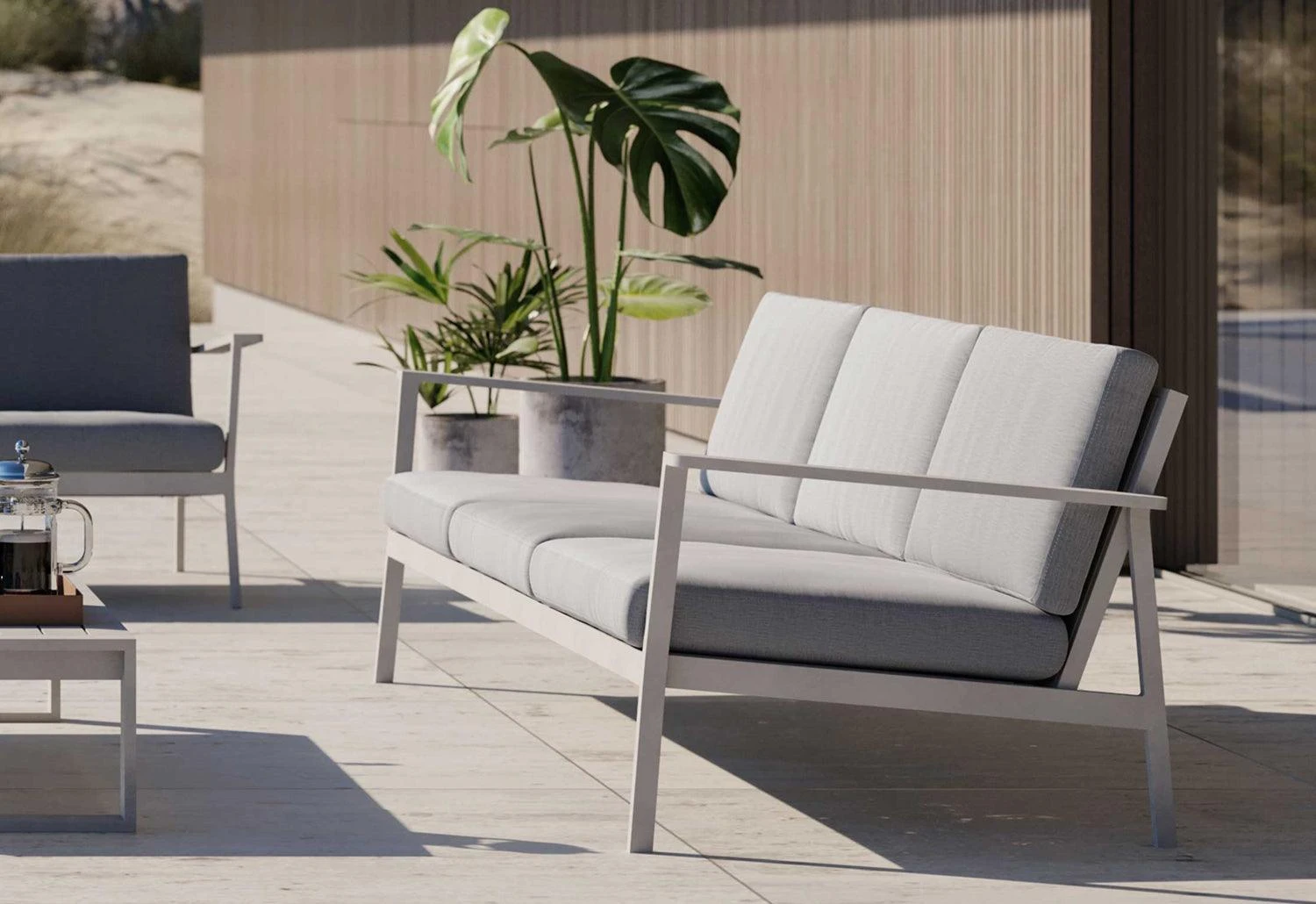 The nature of the weather-resistant aluminium frame prevents rust and has a low maintenance finish making it a perfect addition to your outdoor collection. The sofa is upholstered with comfortable cushions and seat pads suitable for external use.