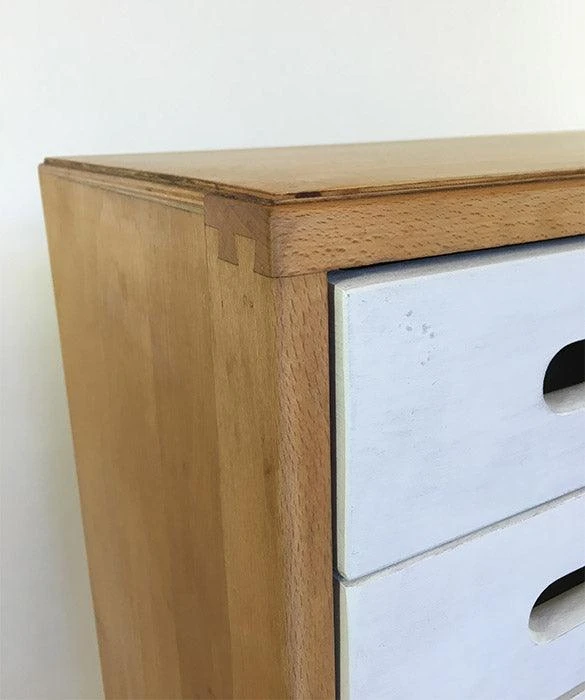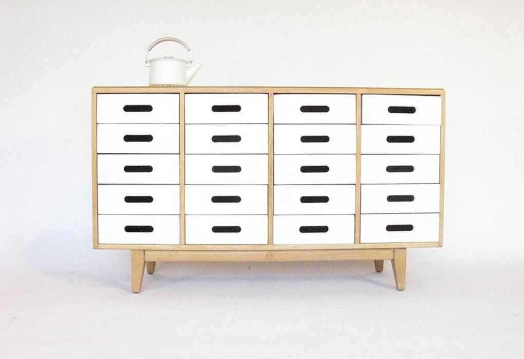 Chest of drawers designed for Educational Supply Association, a forwarding thinking British manufacturer and supplier for schools and institutions. The solid beech construction was designed to be wholly functional and low cost. The simple repeat pattern of drawers with elliptical cut-outs becomes a modern decorative relief.
