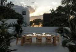 The Atmosfera Outdoor Dining tables boast a subtle, timeless beauty with minimalist slats crafted from solid, premium teak. The frame and table legs feature an inverted ‘L-shape’ miter joint, providing stability and a captivating aesthetic, enhanced by a rounded detail above the tabletop. This subtle contrast perfectly balances geometric lines and calm composure.