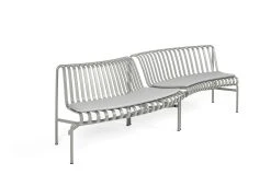 The Palissade Park Dining Bench offers several modules curated to curve in differing directions, enabling the benches to be inward-facing, outward-facing, or a combination of the two. Connecting the various units provides customised seating arrangements and unique layouts to suit specific functional and aesthetic requirements.