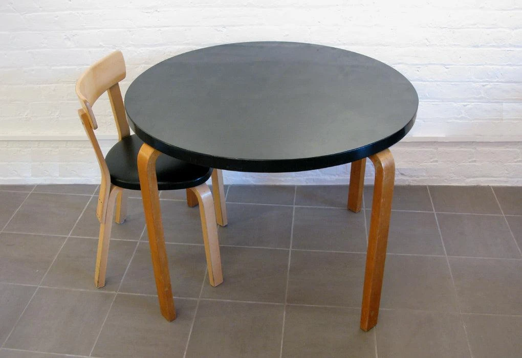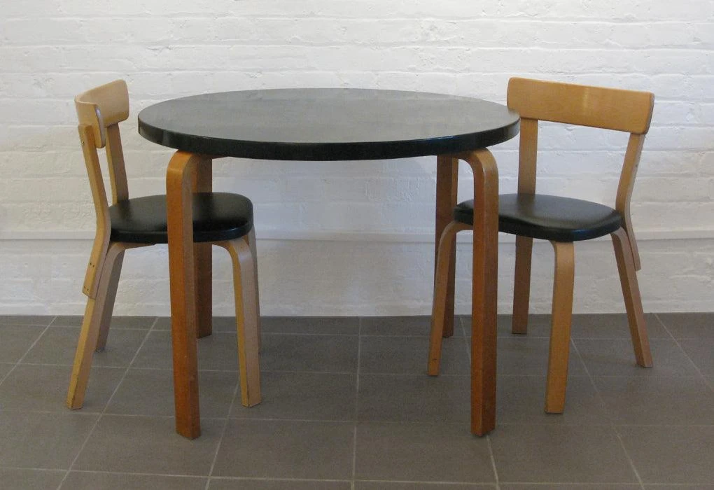 Aalto’s revolutionary ‘bent-knee’ provided a solution to a historical and practical problem of connecting the vertical and horizontal planes. The harmonious and appealing resolution was achieved through inserting thin laminates into slots cut into the solid birch leg. Aalto’s design allowed for a host of different table and chairs designs.