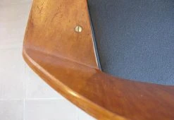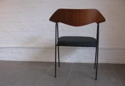 The 675 shares the same highly sculptural ‘floating’ plywood back and armrest as the Festival Hall group. The fine gauge stove-enamelled frame clearly defines the structure of this design, as it did throughout this range of designs, and similarly in the Reclining chair.