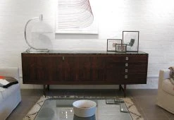 The cabinets and drawer sets were produced with an Agbar carcass and a selection of different veneered fronts could be specified. The simple cut-out drawer-pull and turned leg create a restrained modernist aesthetic.