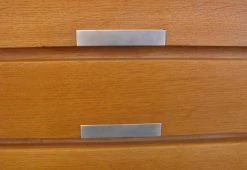 The oak desk produced by Preben Schou Anderson displays a simple and timeless outline. The arrangement of twin pedestals and shadow-gap delineation between drawers and top creates a striking elevation. The use of inset aluminium drawer pulls and sabots on the legs create a very individual and high quality value to the desk.