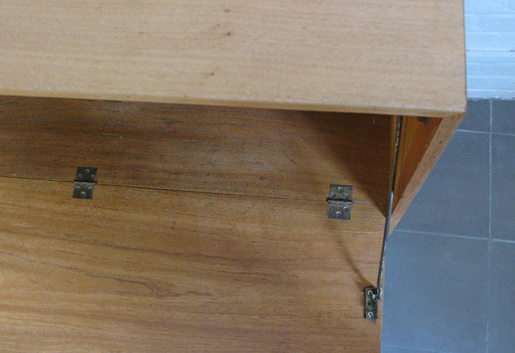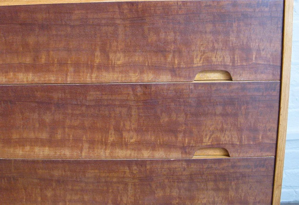 The Junior desk had a single drawer pedestal in contrast to Senior with twin pedestals. The striking design employs a cantilevered top, its surface finished with inset linoleum. The stove-enamelled frame is strictly minimal in construction and dimension with contrasting aluminium alloy foot-rail.The mahogany carcass also distinguished against the blond ash veneered drawer fronts. This example uses brass handles rather than the cut-out handles more widely used in the Hilleplan ranges.
