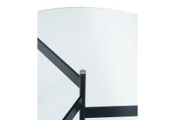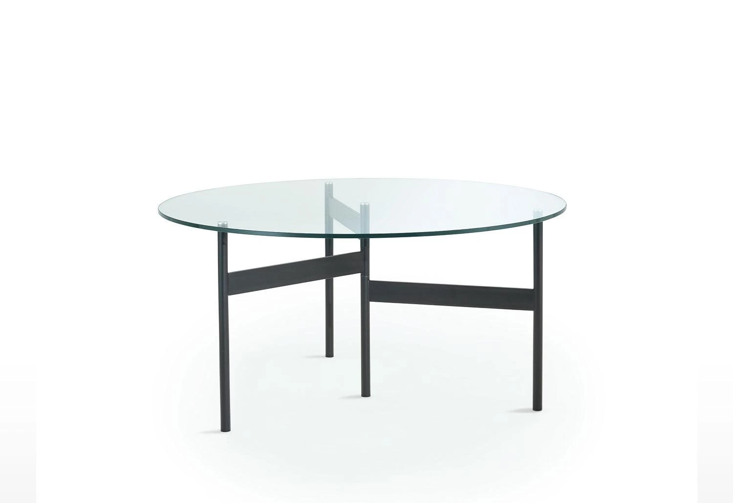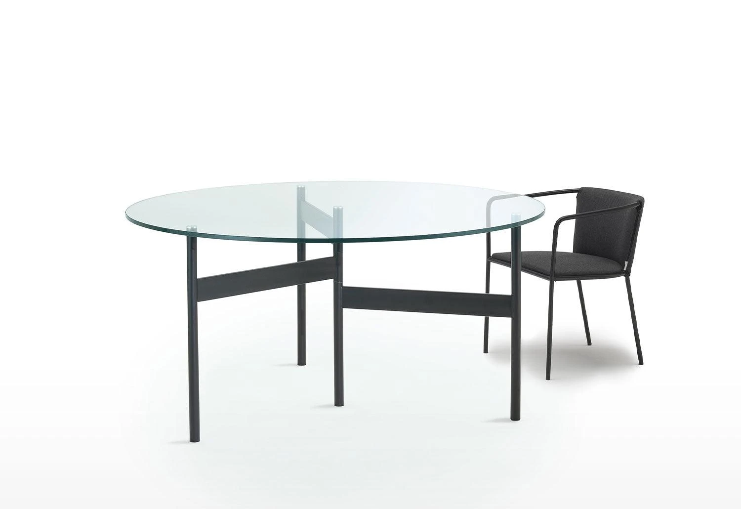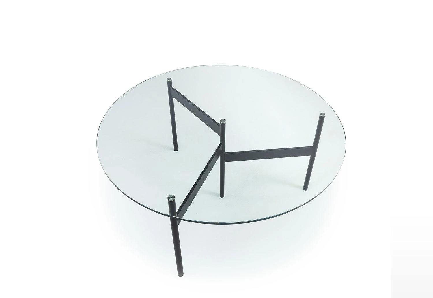 Round outdoor table with a tabletop that rests on three slender legs, connected to a central rod by metal bars placed at different heights which adds a graphic element to the design.