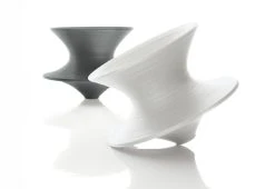 The plastic chair is covered with a detail of fine ridges, like the grooves on an old vinyl record, which add comfort and reinforce the rotational shape of the form.