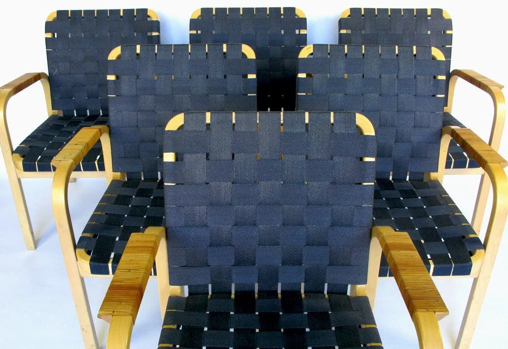 Aalto designed the 45 Chair in 1947. The frame is composed of solid and laminated birch with linen cross-woven webbing acting as support for seat and back. The armrests are wrapped in rattan, adding a naturalist feature and tactility, as was used in several of Aaltoโs architectural projects.