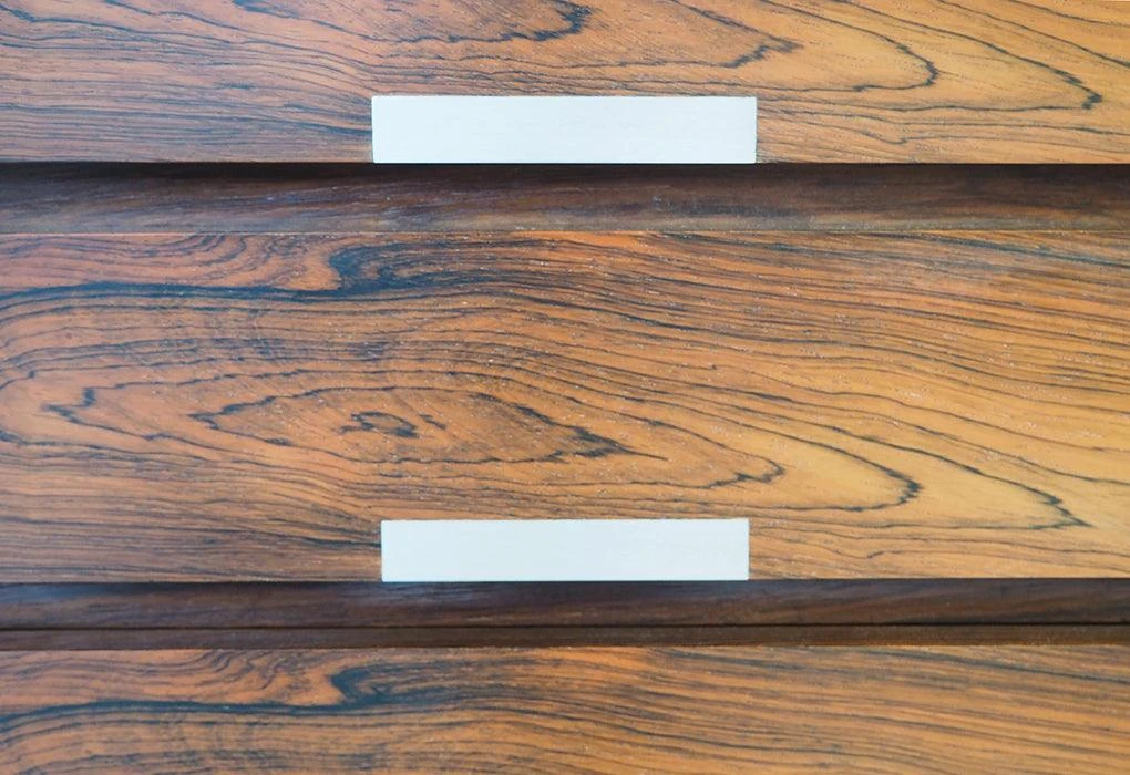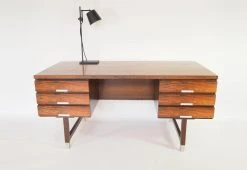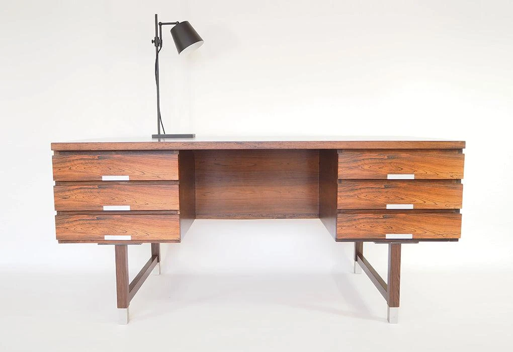 The rosewood desk produced by Preben Schou Anderson displays a simple and timeless outline. The arrangement of twin pedestals and shadow-gap delineation between drawers and top creates a striking elevation. The use of inset aluminium drawer pulls and sabots on the legs create a very individual appearance and reflect the high-quality cabinet-making employed in the desk’s manufacture.