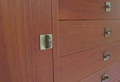 The solid and veneered teak cabinet offered reflects a similar geometric and simple arrangement in its design. The frame is clearly defined as both a structural element and through the exposed joints, a decorative detail. The exposed hinges reflect classical and historical influences. Overall the cabinet demonstrates a timeless quality. The high cost of cabinetmaking to achieve the fine detailing, married with brass hardware meant it was an expensive design and now a scarce example of high quality Danish design.