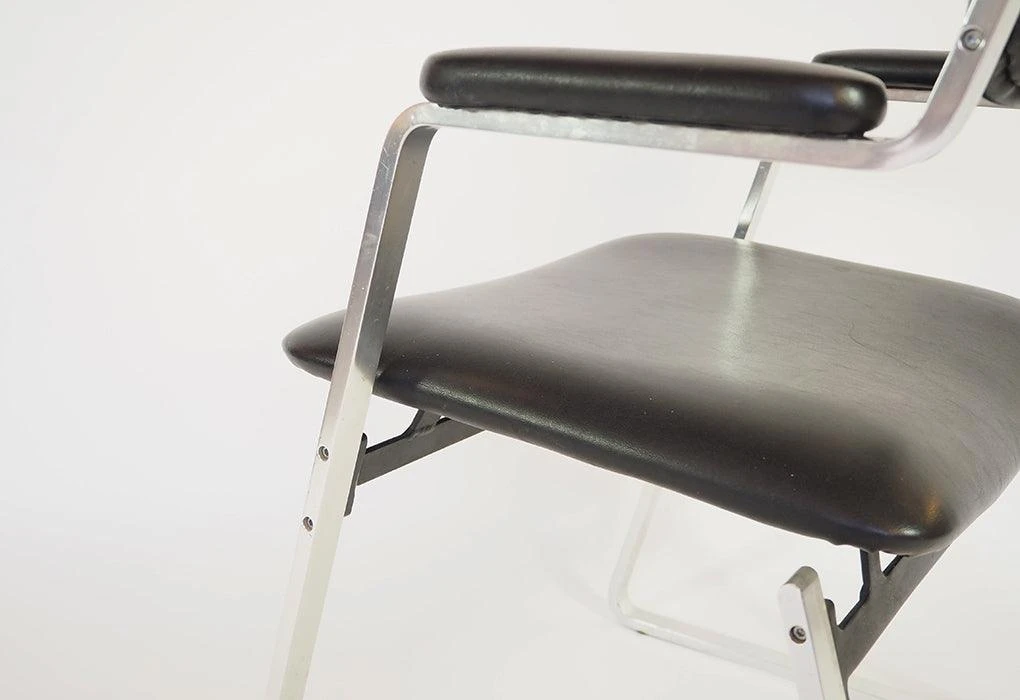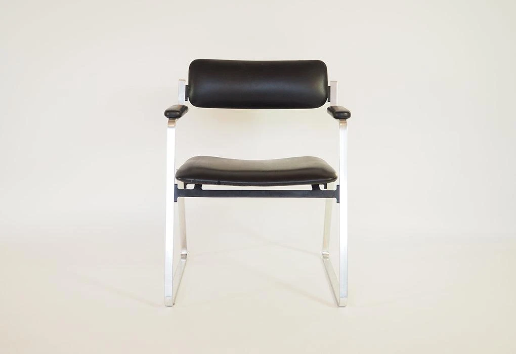 The Mitcham chair reflects many of Plunkett’s aesthetic and theoretical aims to achieve functional elegance. The design is distinguished by its minimal aluminium frame and reduced structural elements. The upholstered elements float within the design. The arm and back act in cantilever, providing the user with a degree of movement, and thus fulfilling the designer’s quest for comfort. The Mitcham is a generous chair, offering good width and curved plywood planes for seat and back.