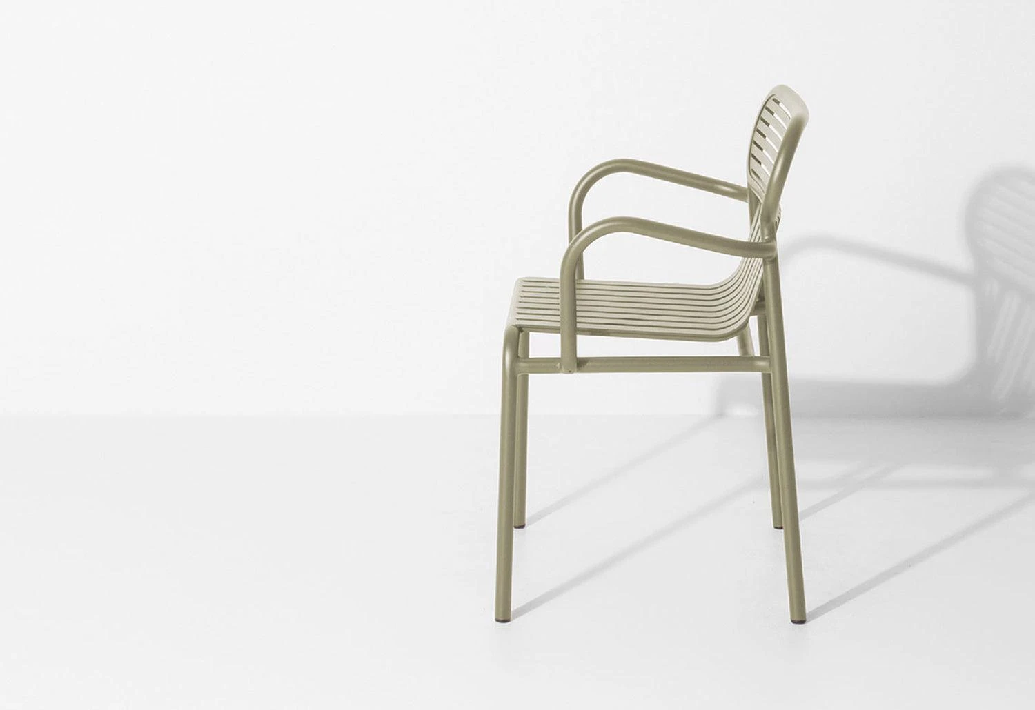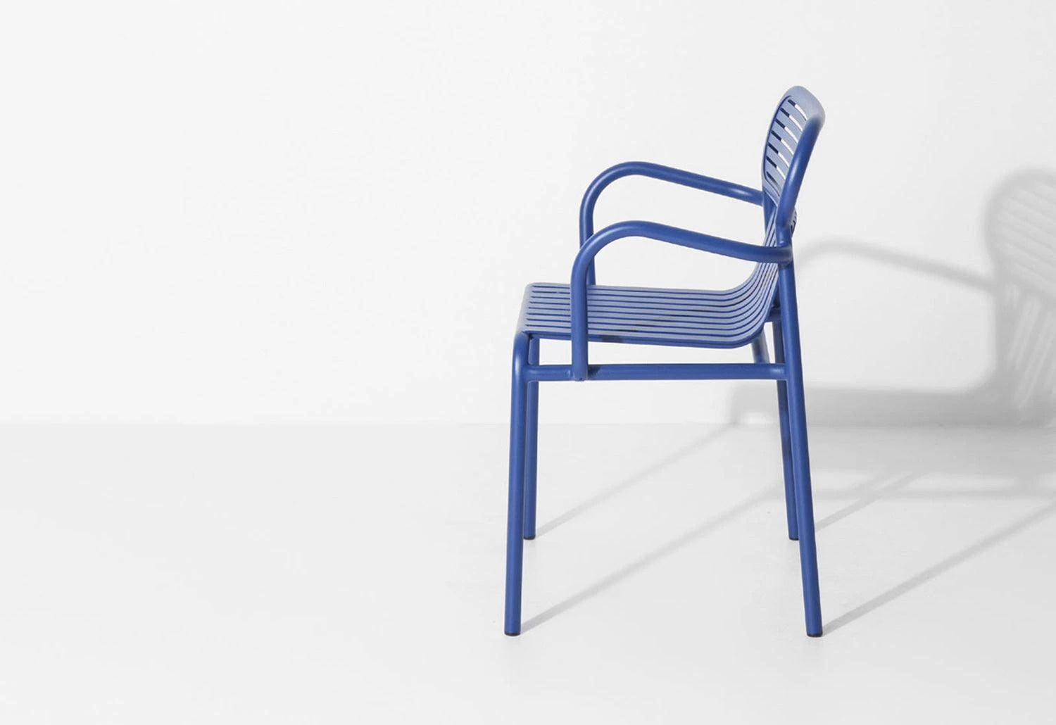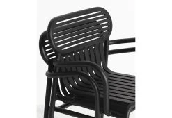 Vertical and horizontal slatted metal seats and backrests combine with an oval-shaped frame element to create a strong graphic presence, lending a distinctive identity to this strongly contemporary collection.