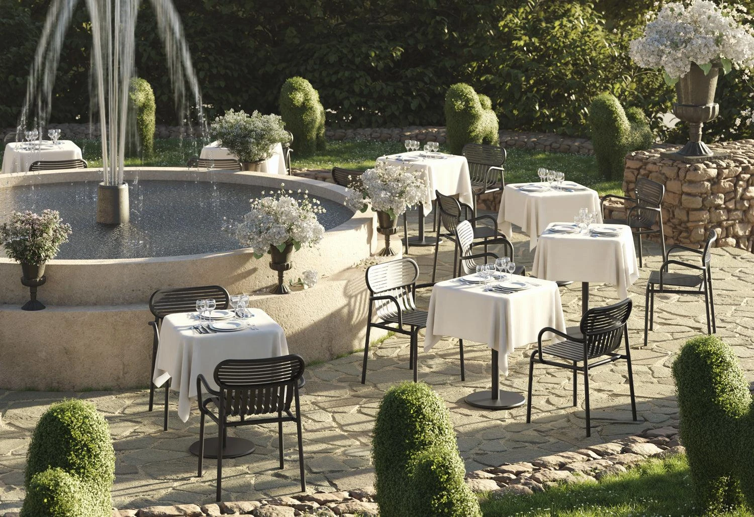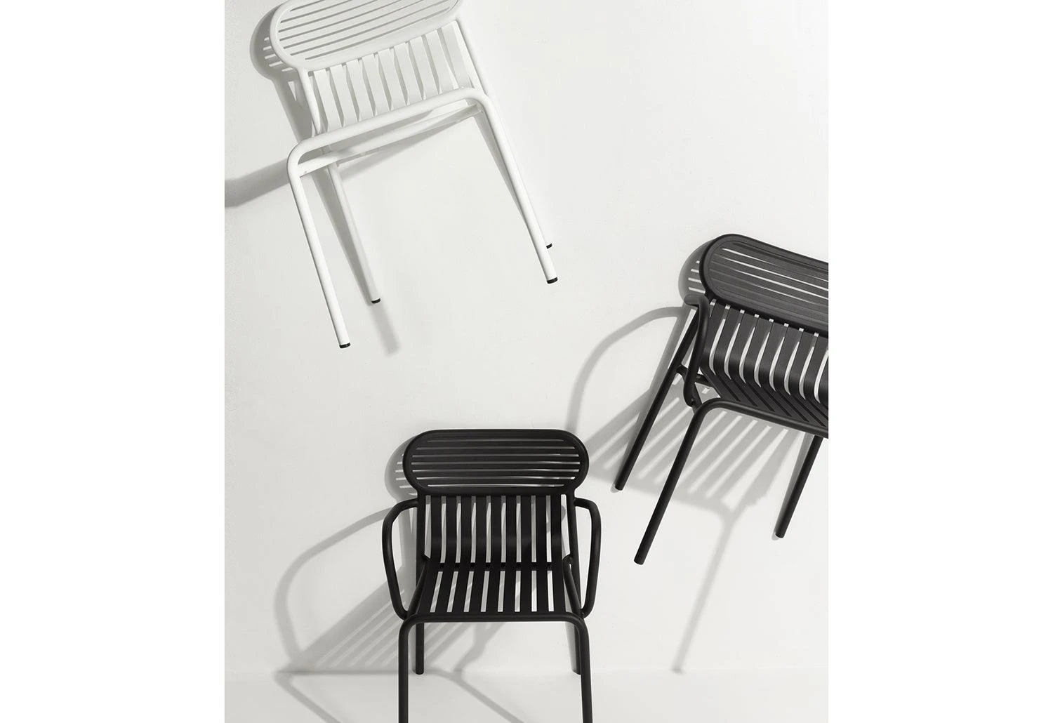 The Week-End family of outdoor furniture includes side chairs, armchairs, lounge chair, tables and bar stools.