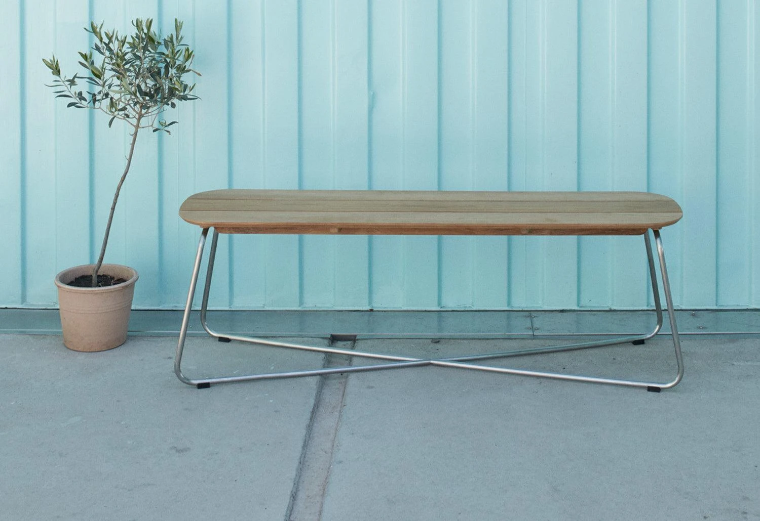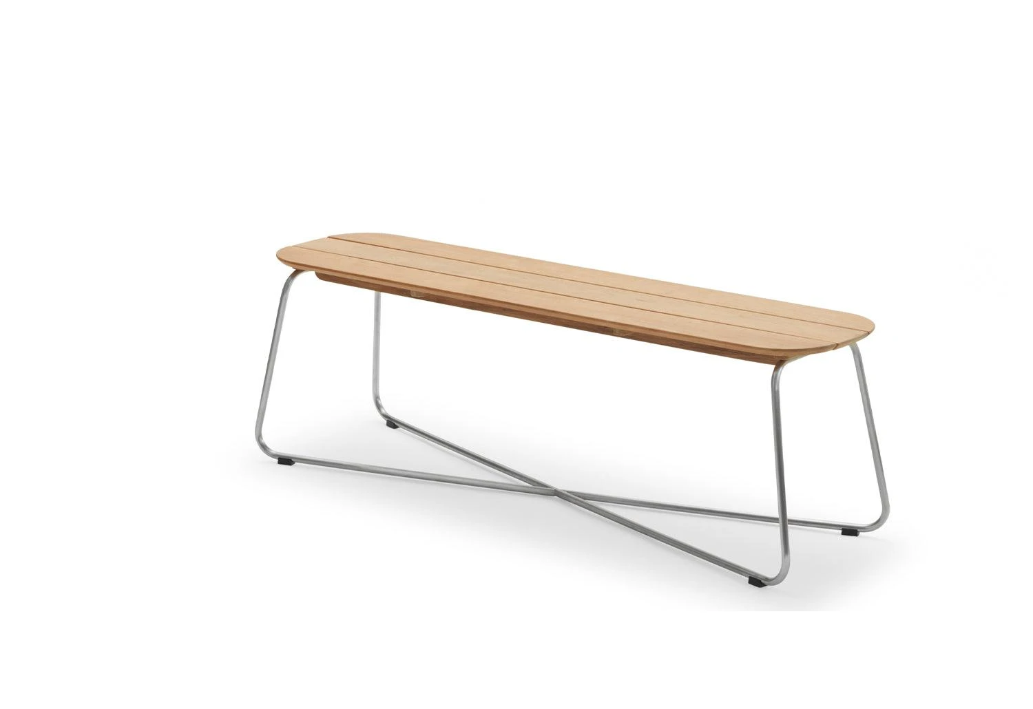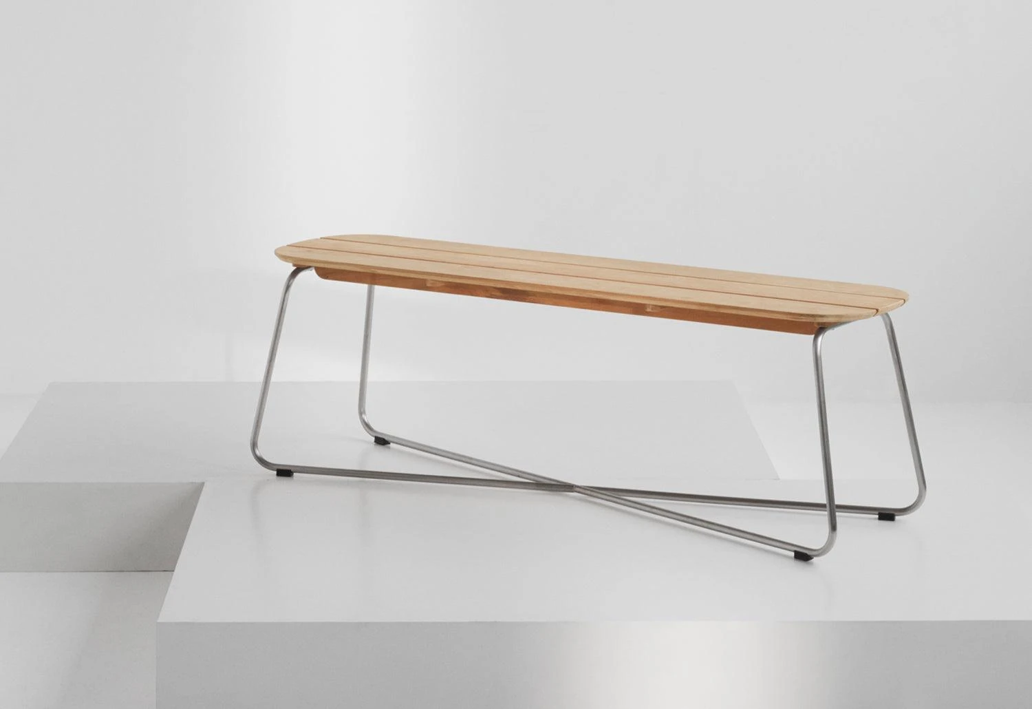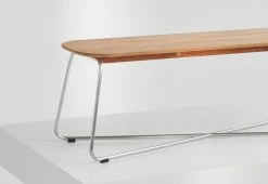 The versatile Lilium bench features an oblong teak-plank tabletop which is elegantly contrasted by a slender x-shaped steel frame. The bench handsomely pairs with the Lilium table but can also stand alone as a low lounge table.