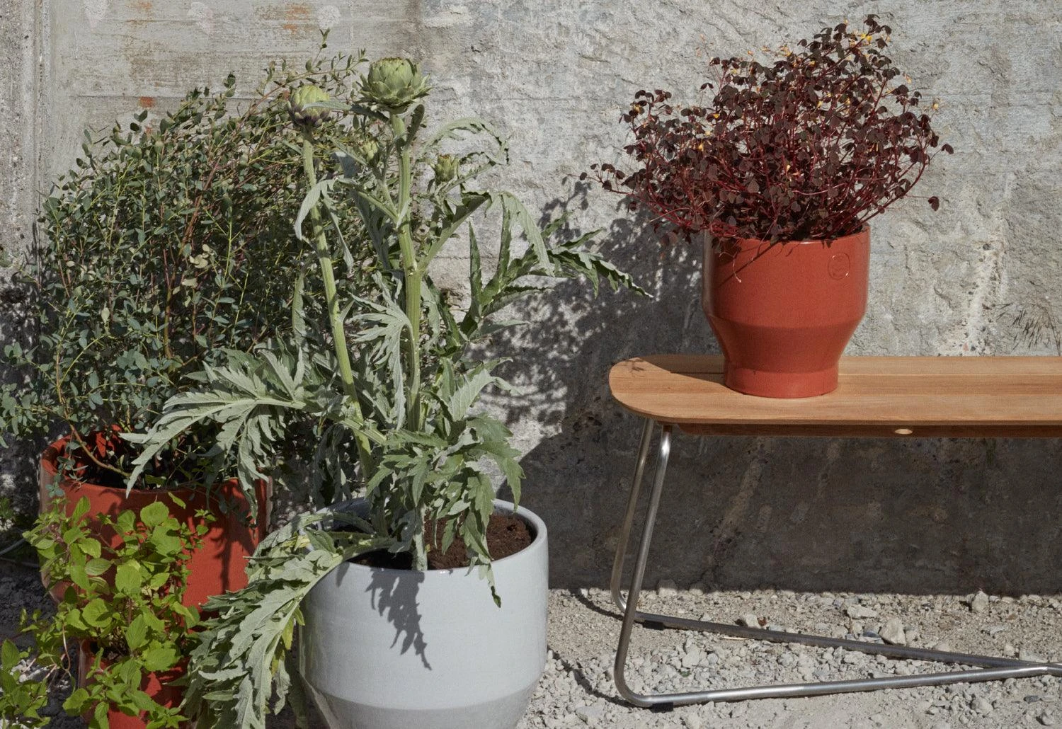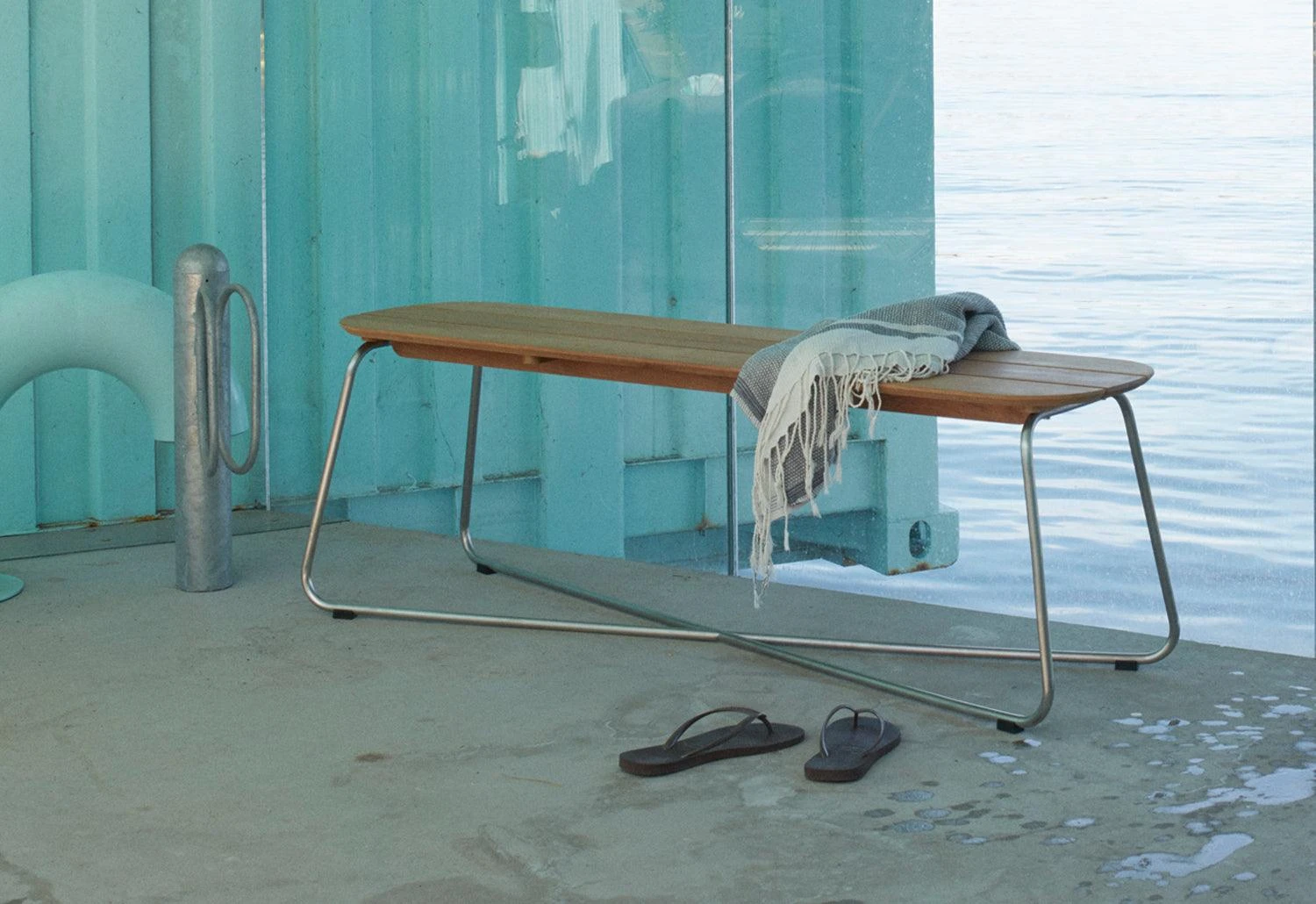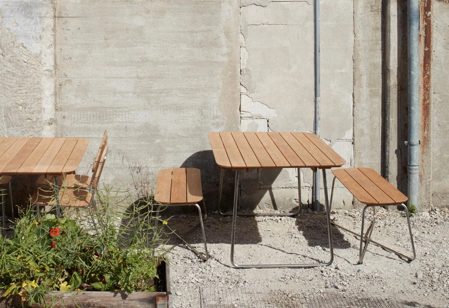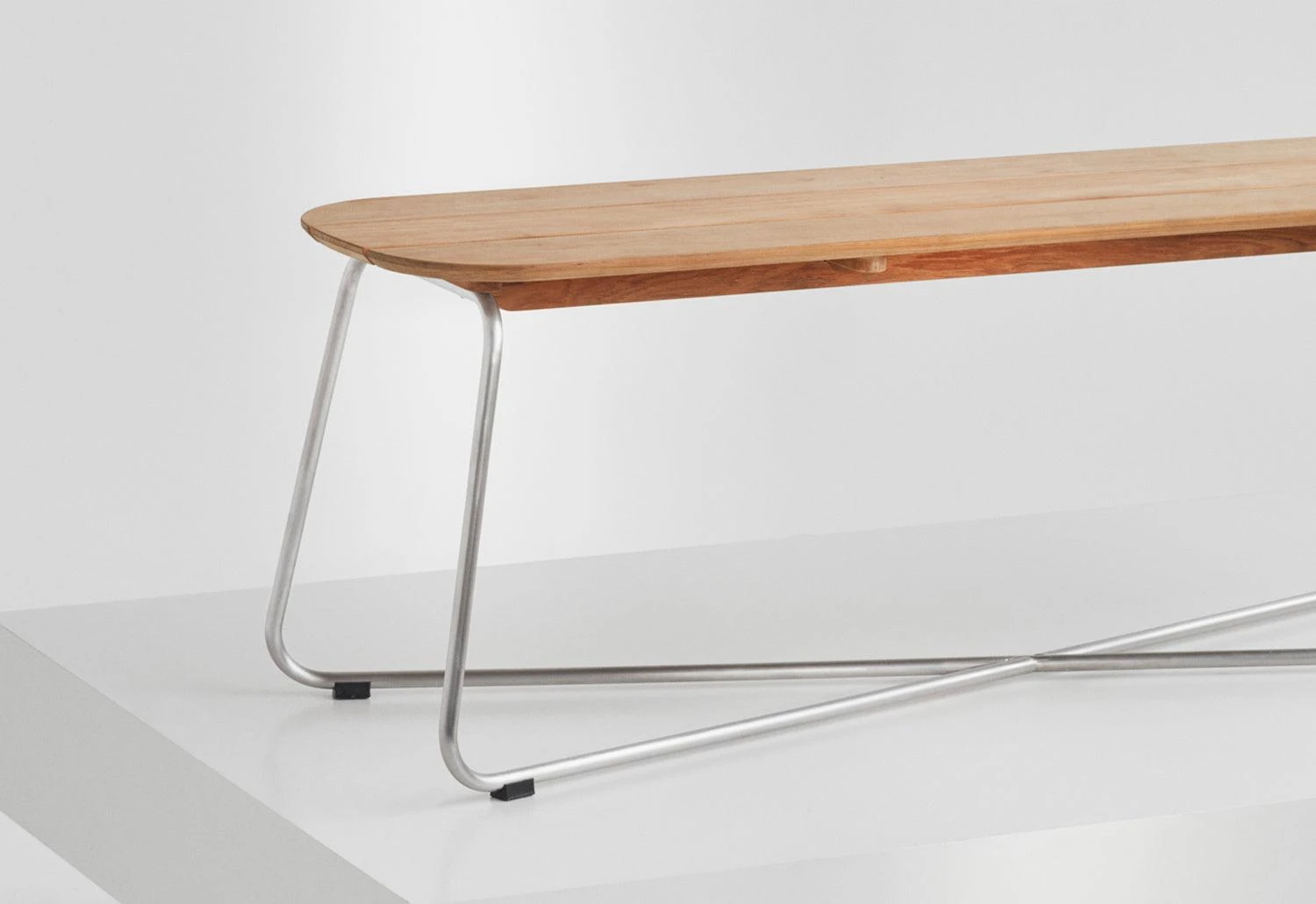 The versatile Lilium bench features an oblong teak-plank tabletop which is elegantly contrasted by a slender x-shaped steel frame. The bench handsomely pairs with the Lilium table but can also stand alone as a low lounge table.