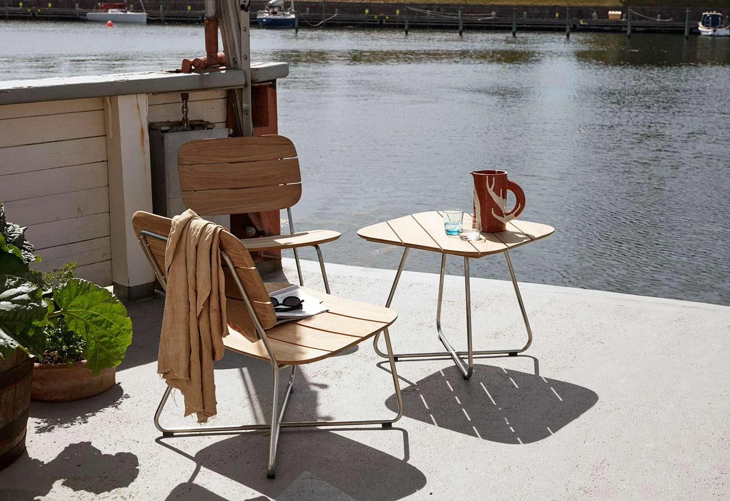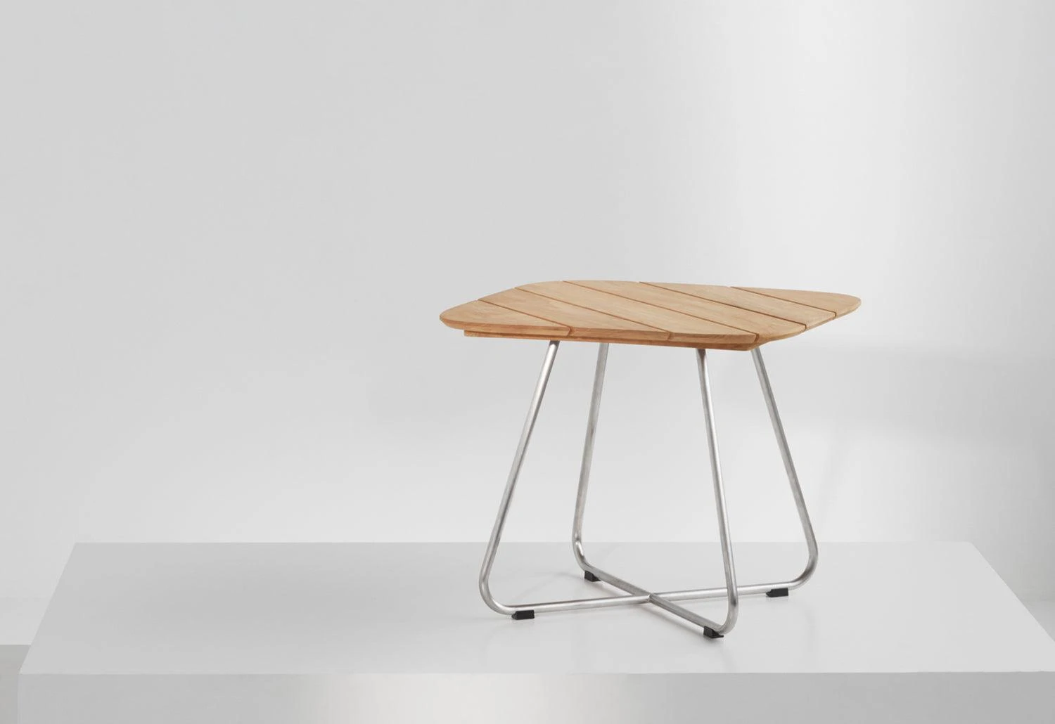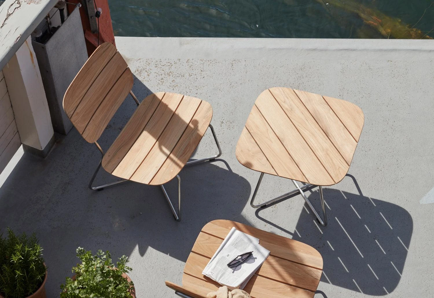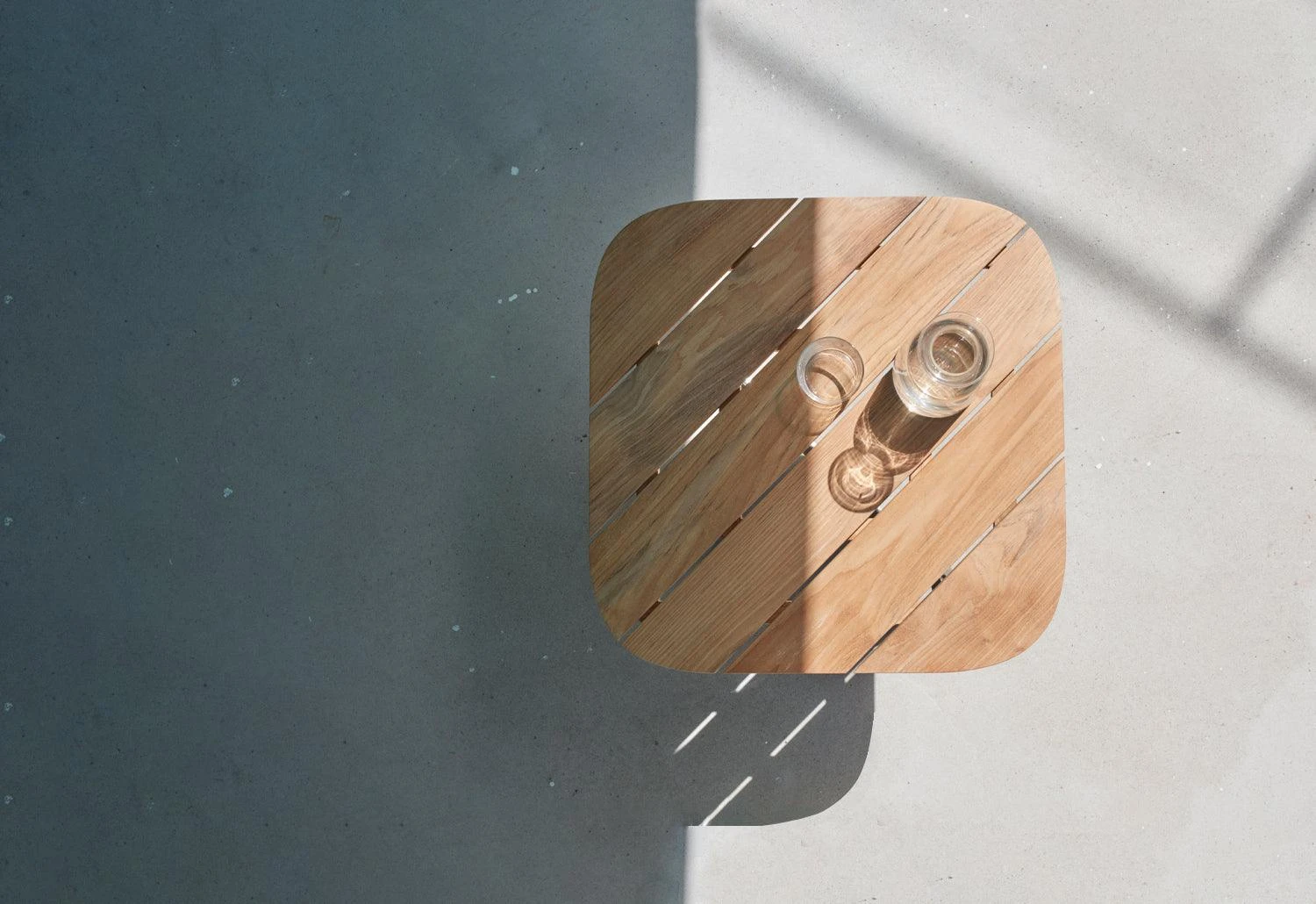 The Lilium lounge table completes BIG’s contemporary outdoor collection. The square side table features diagonally placed teak planks and a slender x-shaped steel frame.