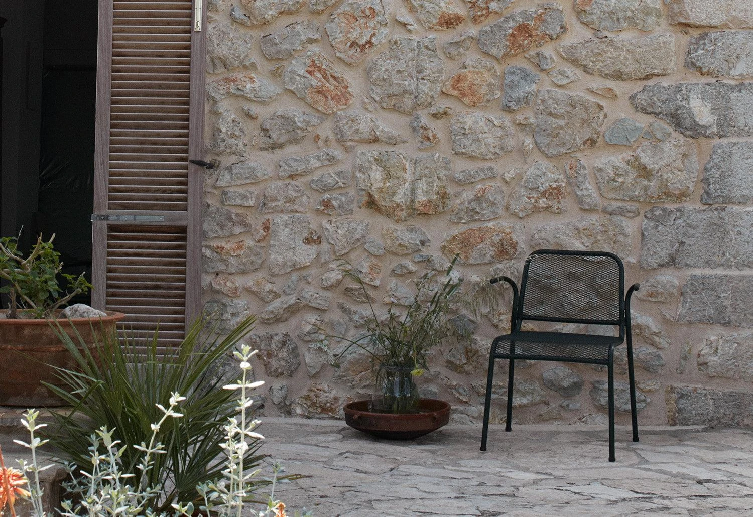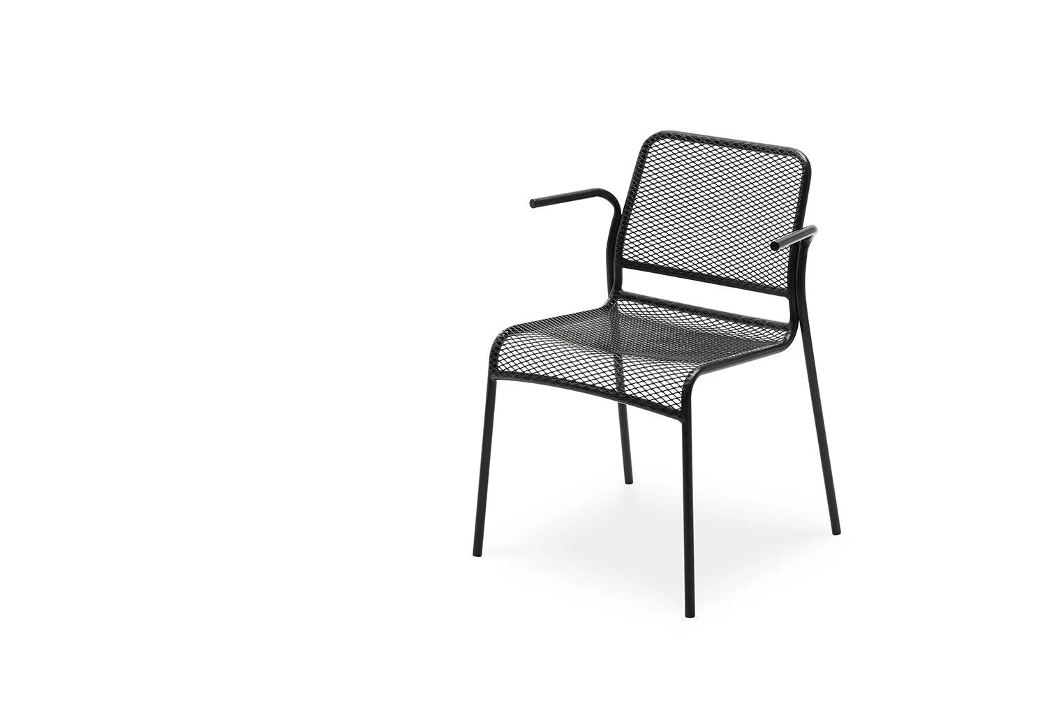 Mira is a stackable outdoor metal chair with a seat and back formed from wire mesh.