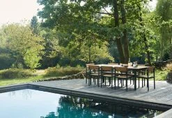 At home on a leafy porch or by the pool on a hotel terrace, the Pelagus armchair is a great choice for outdoor dining. Featuring an aluminium frame in Light Ivory or Hunter Green colour, the chair also comes with an FSC certified teak seat making it a great option for outdoor use.
