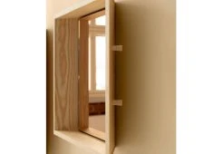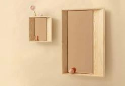 The base of the solid pine structure doubles as a shelf, and the mirror is complete with a row of discreet, functional hooks on the back of the larger angled side.