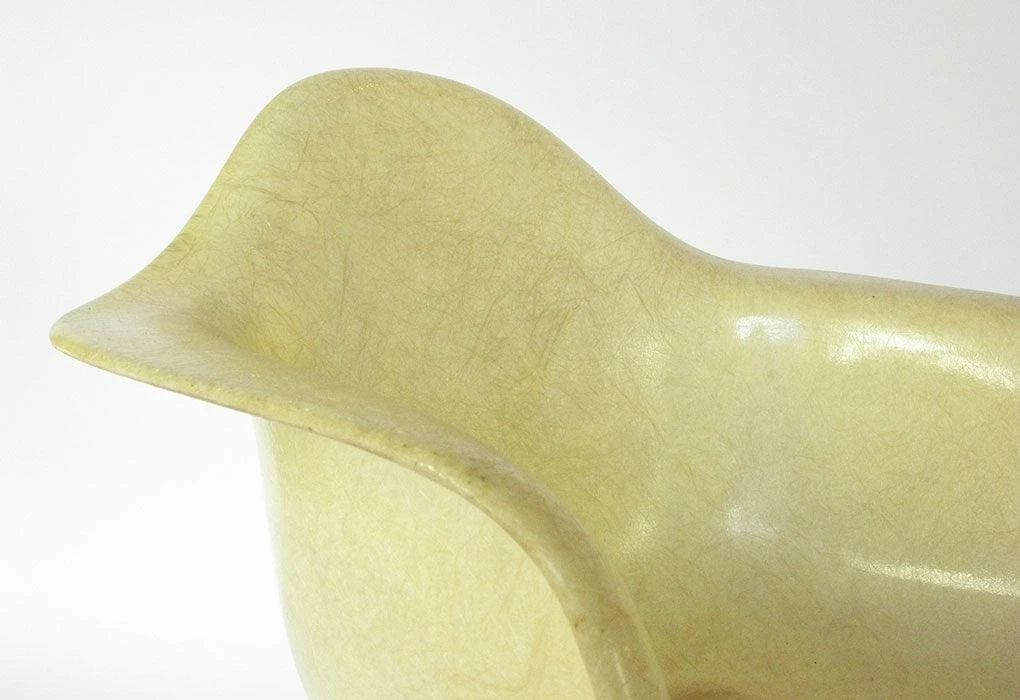 The Eames’ first used fibreglass cloth and plastic resin material as screens in their Case Study House of 1949. They worked with Zenith Plastics, a specialist firm to develop a plastic version of a design for stamped metal chair. The first models were exhibited in the 1950 MOMA exhibition Low Cost Furniture Design. The tooling and engineering costs were extremely high, and chairs were hand-made. The early examples were reinforced through an embedded rope edge to the seat.