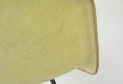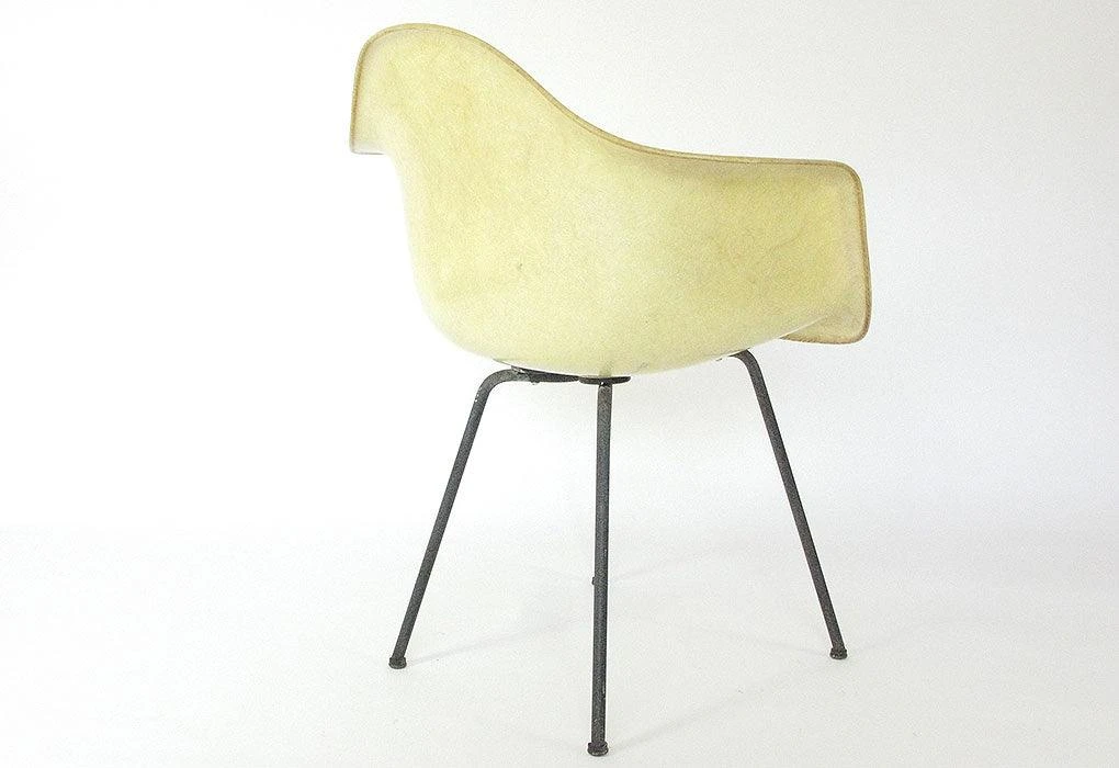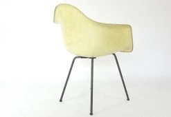 DAX (Dining Armchair X-base) was a model aimed dining or desk usage, with a minimal 4-leg base, constructed with overlapped steel cross beneath. The chair offered is an early Zenith example with rope edge and large shock mounts. The X-base is constructed in solid steel rod. The colour is documented as ‘Lemon Yellow’ and demonstrates high levels of translucency as was the character of the early, hand-made fibreglass shells. The shock mounts are clearly seen through the shell. This chair was originally purchased in USA.