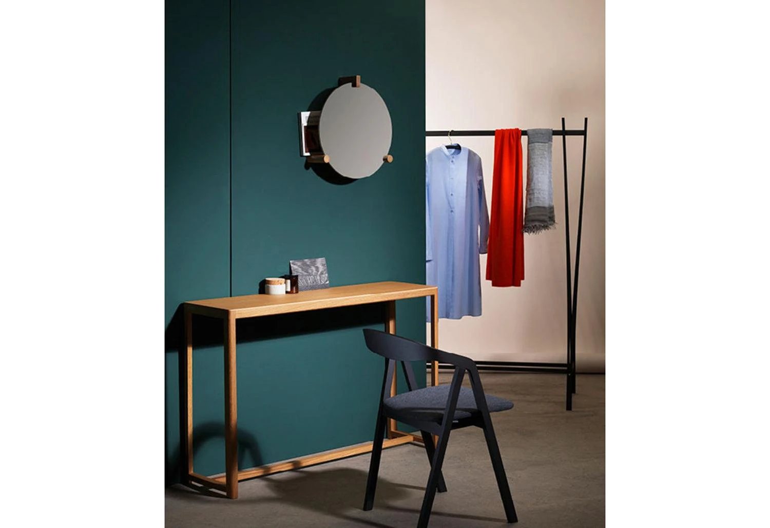 A round wall mirror with wooden accent mounts, hook and shelf. The contemporary and compact design works well in a dressing area, hallway or bathroom.